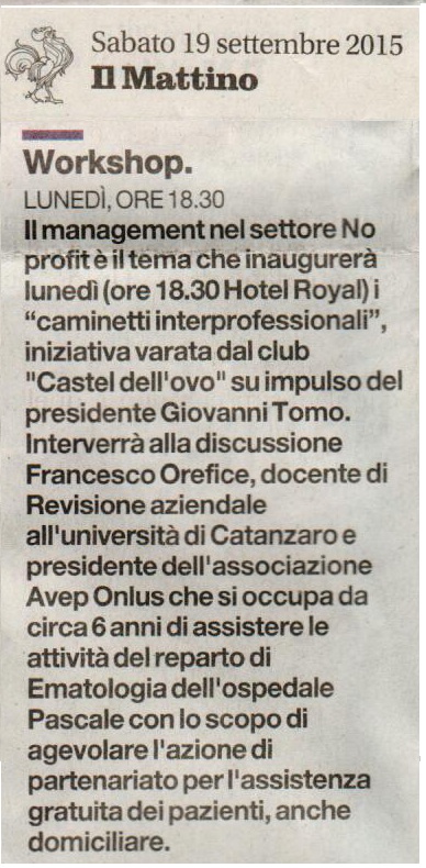 Il relatore, Francesco Orefice, Socio del Rotary Club Napoli Nord, dottore commercialista e docente di revisione aziendale presso l’Università di Catanzaro, Presidente e fondatore della A.V.E.P. Onlus che si occupa da circa 6 anni di assistere il Reparto di Ematologia della Fondazione Pascale di Napoli con lo scopo prevalente di finanziare in partenariato l’assistenza domiciliare gratuita, fornirà un validissimo esempio di quanto sia importante “mettere a sistema” il “fare impresa” nel settore del no profit; in particolare sarà evidenziato l’impatto straordinariamente positivo dell’impegno sociale sul servizio sanitario erogato, mediante il ricorso a un sistema innovativo di misurazione della performance preso in prestito dal mondo delle imprese.