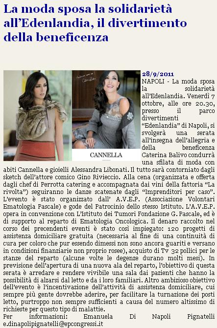 La moda sposa la solidarietà all'Edenlandia. Venerdì 7 ottobre, alle ore 20:30, presso il parco divertimenti "Edenlandia" di Napoli, si svolgerà una serata all'insegna dell'allegria e della beneficenza. Caterina Balivo condurrà una sfilata di moda con abiti Cannella e gioielli Alessandra Libonati.
