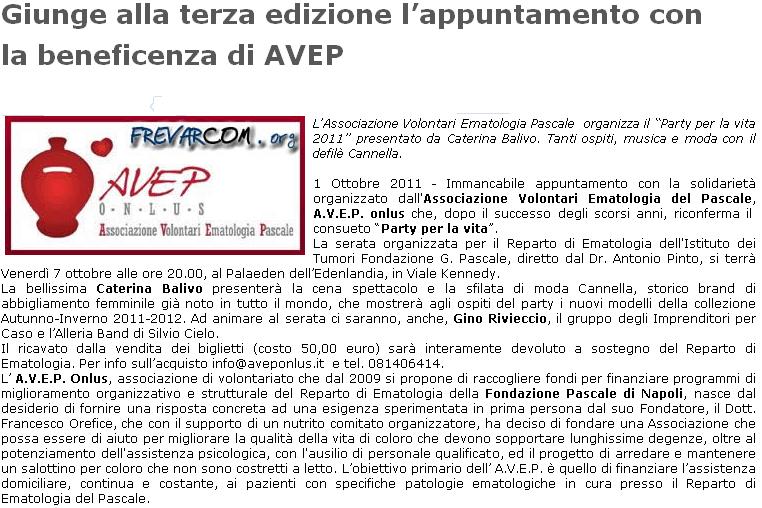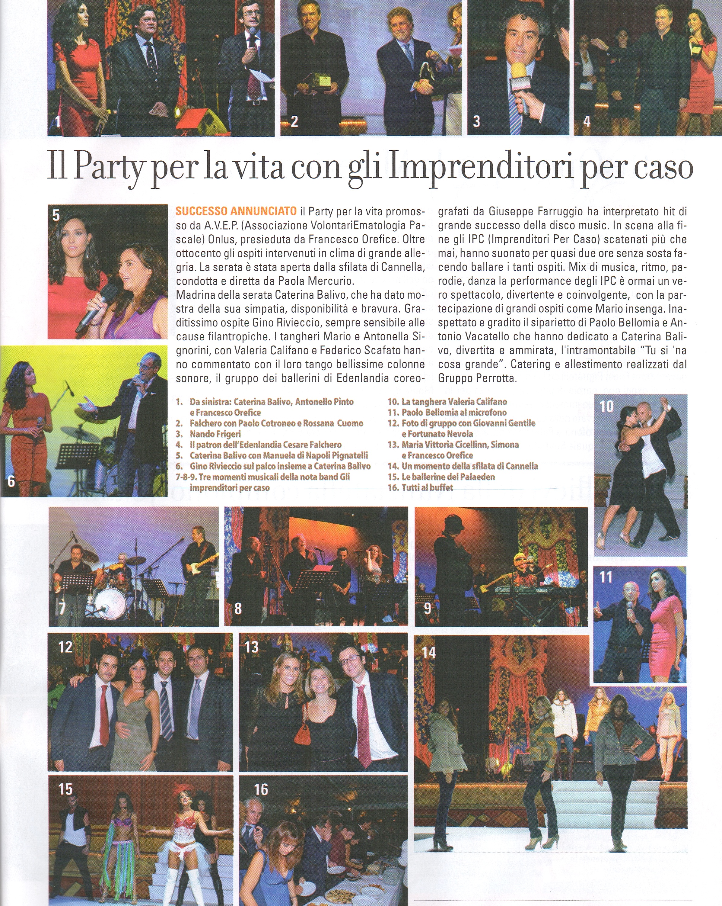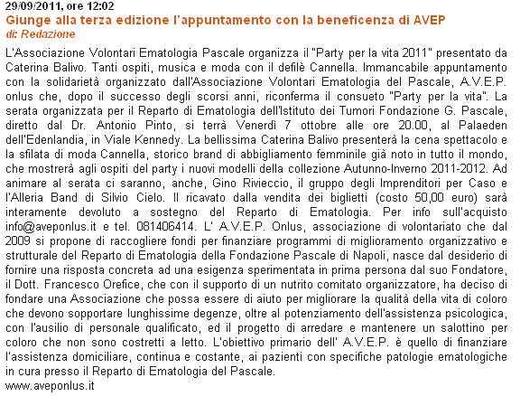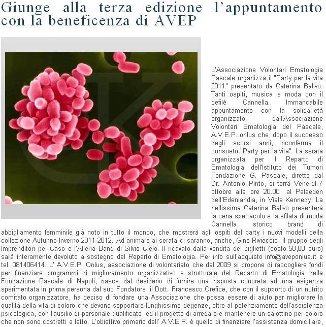 L'associazione Volontari Ematologia Pascale organizza il "Party per la vita 2011" presentato da Caterina Balivo. Tanti ospiti, musica e moda con il defilè di Cannella. Immancabile appuntamento con la solidarietà organizzato dall'AVEP Onlus, che dopo il successo degli scorsi anni, riconferma il consueto Paty per la vita.
